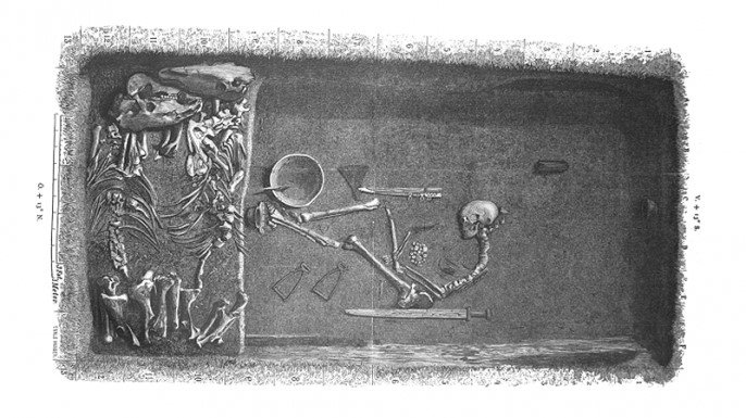 Bj 581 mezarının arkeolog Hjalmar Stolpe tarafından yapılan orijinal planına dayanan 1889 tarihli, Evald Hansen imzalı çizimi. (Fotoğraf: Online Wiley Kütüphanesi/Wiley Periodicals Inc. Amerikan Fiziksel Antropoloji Yazarları Dergisi Yayınları/CC BY 4.0)