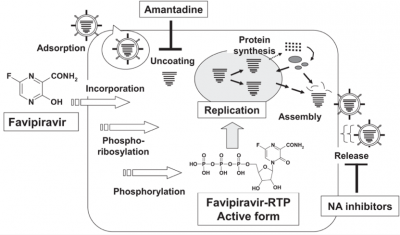 Faz II çalışmaları ABD’de Faz III çalışmaları ise Japonya’da tamamlanmış olan ilaç (Favipiravir; T-705; 6-floro-3-hidroksi-2-pirazin karboksamid), konak hücresinin enzimleri tarafından aktif formu olan favipiravir-ribofuranosil-5p-trifosfat (RTP)’a fosforibosillenir ve influenza virüsünün RNA-bağlı RNA polimerazının aktivasyonunu durdurur.(14)