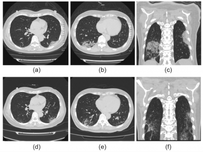 Favipavir verilmeden önceki göğüs görüntülemesi (a-c). 12 günlük Favipiravir sonrası görüntüleme (d-e).