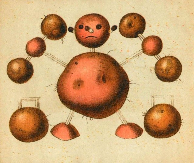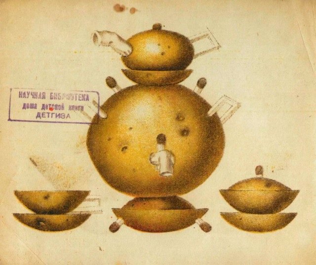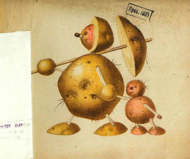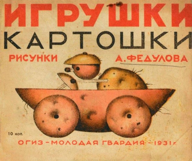 1931 tarihli bu Sovyet kitabının ismi “Patates Oyuncaklar”. Kitapta, tamamı patatesten yapılmış oyuncakları gösteren birbirinden ilginç çizimler yer alıyor. Kitabın kapağında, çizimlerin sanatçı A. Fedulov’a ait olduğu ve kitabın fiyatının 10 kapik olduğu yazıyor. Patatesmobilini süren bir patates yoldaşın yer aldığı kapağı kaldırıp kitabın içini açtığınızda bambaşka karakterlerle karşılaşıyorsunuz…