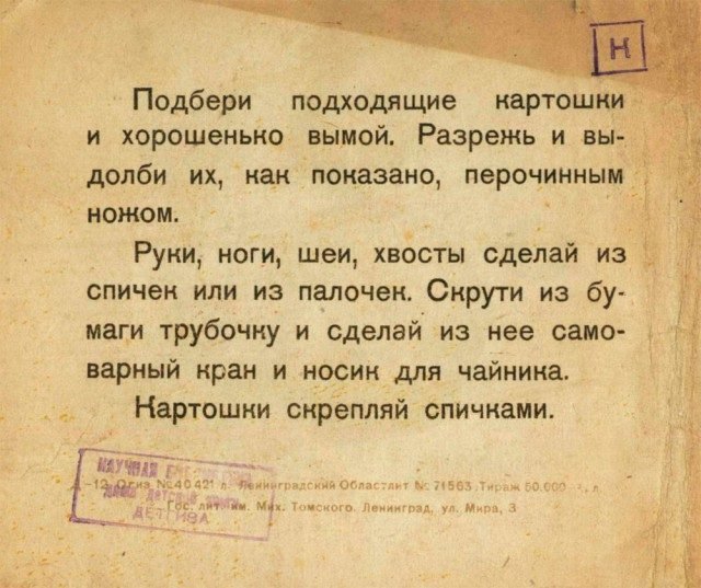 “Düzgün birkaç patates bulun ve onları güzelce yıkayın. Bir bıçak yardımıyla kesin. Kibritten veya çubuktan kol, bacak, boyun, kuyruk gibi uzuvlar yapın. Bir kağıt parçasını rulo haline getierek semavere kulp yapın. Patatesleri bir arada tutmak için kibritlerden yardım alın.”