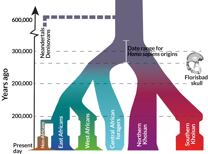 Yeni bir DNA çalışması baz alınarak oluşturulmuş bu diyagramda, Homo sapiens 350.000 ila 260.000 yıl önce genetik olarak farklı bir tür olarak ortaya çıkıyor. Afrikalı h. Sapiens popülasyonu iki kola ayrılıyor ve daha sonra da yaklaşık olarak 200.000 yıl önce alt kollara ayrılıyor. Sol altta gördüğümüz afrikalı olmayan popülasyonlar ise 100.000 yıl önceden biraz sonra ortaya çıkıyor.