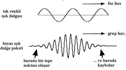 Güneşin beyaz ışığını bir cam prizmadan geçirdiğimizde yedi renge ayrıştığını biliriz. Bu tekrenkli ışıkların her biri, belli dalgaboyunda birer ışığı temsil eder. Her bir dalgaboyunun hızına “faz hızı” diyoruz. Fakat beyaz ışık madde içinde yol alırken, bu yedi rengin oluşturduğu bir “dalga paketi” gibi davranır. Bu dalga paketinin hızına da “grup hızı” diyoruz. Grup hızı, her bir rengin faz hızından farklıdır. Bunu gündelik hayatta da görebilirsiniz. Bir vapur geçerken ardında oluşturduğu dalgayı gözleyin. Bu dalgada bir tepe noktasını (bir fazı) izleyin. Bu tepe noktasının biraz ilerledikten sonra kaybolduğunu, ama ardından gelen diğer bir tepenin büyüyüp bir süre yol aldığını gözlersiniz. Yani, dalgayı oluşturan fazlar nasıl hareket ederse etsin, ilerleyen şey, “grup hızıyla hareket eden dalga paketi”dir.