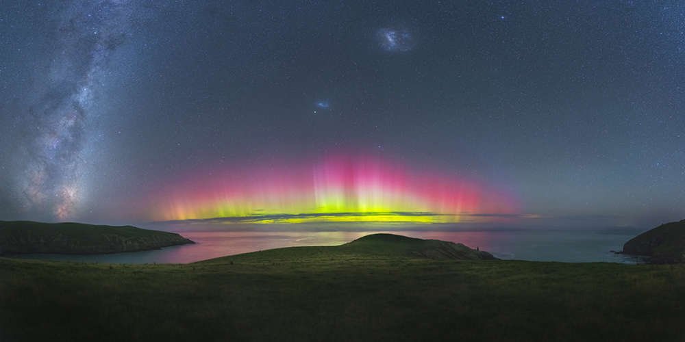 Bir astronomi tutkunu şu fotoğraftan başka ne isteyebilir ki? Ortada pembe ve sarı güney ışıkları, etraflarında ise üç galaksi: Samanyolu, Büyük Macellan Bulutu ve Küçük Macellan Bulutu.